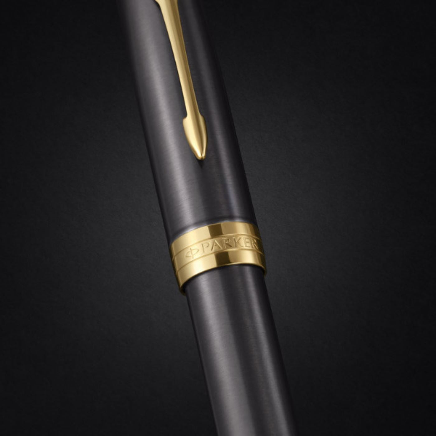 Roler olovka Parker Royal Sonnet Grey Gold Trim – elegantan dizajn sa telom od mesinga, srebrnim poklopcem i zlatnim detaljima. Sofisticiran izbor za pisanje.